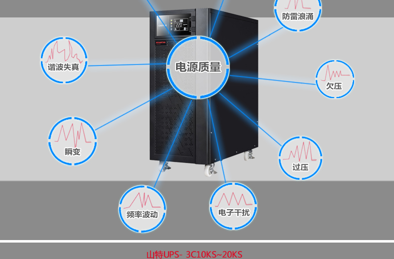 山特3C20KS系列UPS---傳承上一代產(chǎn)品的優(yōu)良品質(zhì),采用雙轉(zhuǎn)換純?cè)诰€式架構(gòu),外形美觀,產(chǎn)品性能和產(chǎn)品可靠性大大提升。 對(duì)電網(wǎng)出現(xiàn)的斷電、市電電壓過高或過低、電壓瞬間跌落或減幅震蕩、 高壓脈沖、電壓波動(dòng)、浪涌電壓、諧波失真、雜波干擾、頻率波動(dòng)等狀 況提供理想的解決方案,為用戶負(fù)載提供安全可靠的電源保障。山特3C20KS是具有強(qiáng)大適應(yīng)性、配置靈活的產(chǎn)品,采用先進(jìn)的DSP數(shù)字控制技術(shù),提供了非常豐富的可擴(kuò)展功能, 用戶可以根據(jù)需要靈活配置。
