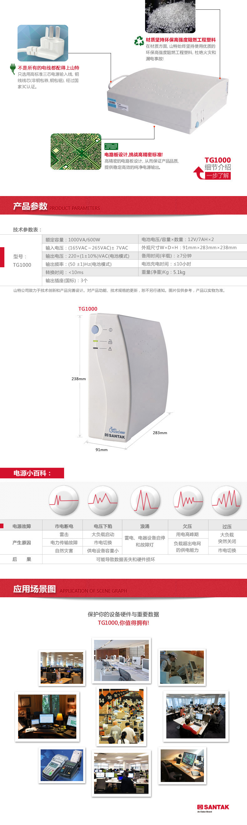 山特TG1000 TwinGuard(TG)系列UPS適用于PC機及其外圍設備(打印機、掃描儀、路由器 、Modem ),穩(wěn)定性高,可靠性強。輕松走入家庭和辦公環(huán)境 ,幫您節(jié)省有效空間。對于PC用戶而言,計算機周圍擁擠不堪的狀況變得輕松、和諧。面板簡潔明快、容易操作。